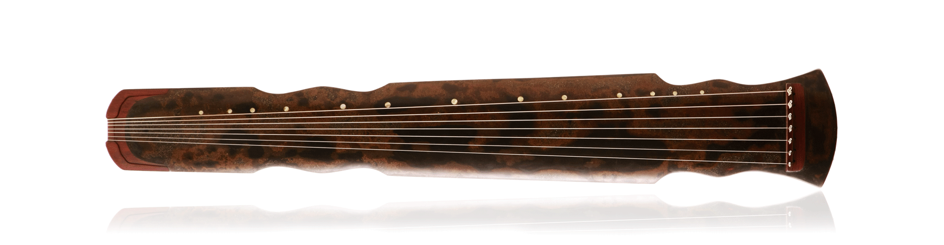 宋琴“松石间意”,原系清宫旧藏,亦是清乾隆帝最为喜爱的一张琴。其“项与腰皆作凹入半月形,相交处复作凸出半月形,通体极长大,池沼皆长方”。(《琴学随笔》)此琴在2010年北京保利秋季拍卖会上以1.3664亿元拍出,创造了世界古琴拍卖纪录,同时也创造了世界乐器拍卖纪录。钧天坊制“松石间意”,造型如初,制作精美,黑漆中隐显红光,小冰裂牛毛断纹,继承了原琴的“其音清穆,其德渊懿”的音色,亦如同乾隆御题诗所言“古锦囊轁龙门琴,朱弦久歇霹雳音”,声若霹雳又不失和净。