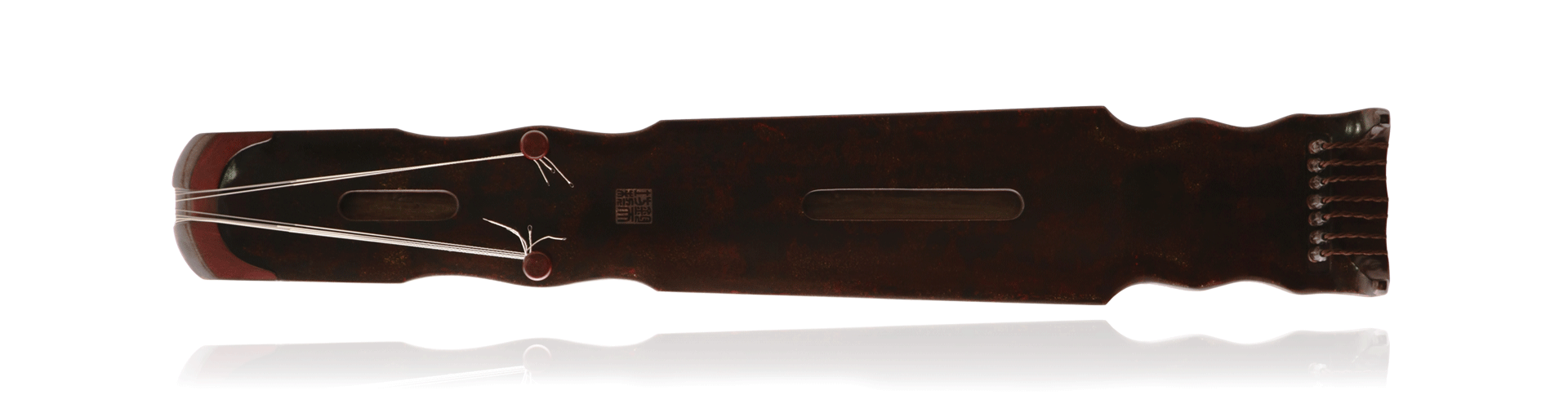 “宣和式”造型来源于凤势式,项腰仍保留凤势式特点,但更着以流线性的弧度处理,即项腰处均为两凹中凸,且从琴额开始曲线内收,额侧微敛,轮廓柔婉秀美,造型浑融统一。宋徽宗独创“瘦金体”书法,瘦挺爽利,苍劲飘逸,舒畅洒脱,富有鲜明个性。由此“宣和式”古琴形制可见其艺术风格之一斑,可谓“天骨遒美,逸趣霭然”。