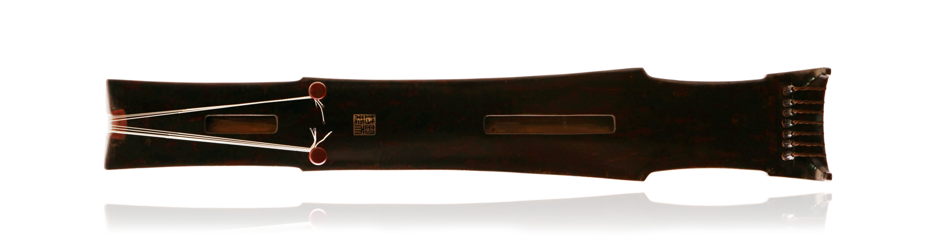 变体鹤鸣秋月,基本造型依仿“鹤鸣秋月”琴式,但在线条上做了更为简洁写意的处理。原式多为圆弧曲线流畅行走,而此处则将曲线一并改为直线,只在转折处施以微弧。自岳山以下为颈,延至琴肩则骤开,颇有大鹏式展翼之风采。琴腰自十徽始,直通焦尾,颇似仙鹤孑立之足,风姿飘逸。此琴音色自然清奇,抚之如临蓬莱幻境,唯见“海山无事,一鹤相从。”(二十四琴品之“清奇”。)
